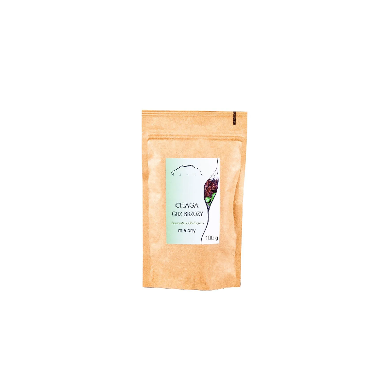 Chaga (Inonotus obliquus) – czyli błyskoporek podkorowy (huba brzozowa, guz brzozy), jest to grzyb o czarnej zewnętrznej barwie i rdzawym miąższu wewnątrz, będący charakterystyczną naroślą, występującą na pniach obumierających drzew, najczęściej brzóz. Występuje na chłodniejszych obszarach półkuli północnej. Inonotus obliquus wykazuje wiele korzystnych właściwości, które wynikają z zawartości takich związków bioaktywnych, jak polisacharydy, beta-glukany, fitosterole, betulina i kwas betulinowy (triterpeny), przeciwutleniacze (chaga posiada najwyższy wynik miary działania antyoksydacyjnego, według skali ORAC). W dawnej medycynie ludowej wywar ze sproszkowanego owocnika stosowano w dolegliwościach żołądkowych. Wierzono również, że spożywanie naparu oczyszcza organizm, redukuje ból oraz poprawia samopoczucie. Ze względu na szerokie spektrum pozytywnego oddziaływania na organizm regularne spożywanie tych grzybów skutkuje wzmocnieniem całego organizmu.