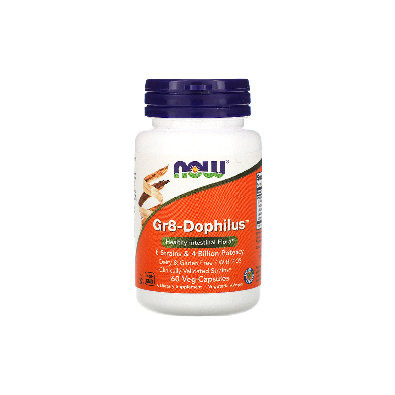 Preparat NOW Gr8-Dophilus zawiera w swoim składzie 8 szczepów żywych kultur bakterii które są niezbędne do ochrony dobroczynnych bakterii jelitowych, jak również zmniejszają ryzyko powstania toksyn w jelitach. Obecnie jednym z najbardziej zalecanych jest szczep Lactobacillus casei GG (LGG). Bakteria ta pochodząca z przewodu pokarmowego człowieka jest oporna na działanie soku żołądkowego i kwasów żółciowych, wykazuje większe zdolności przylegania (adherencję) do nabłonka jelitowego niż inne szczepy Lactobacillus. Ta bakteria ma więc zdolność trwałego zasiedlania przewodu pokarmowego.
