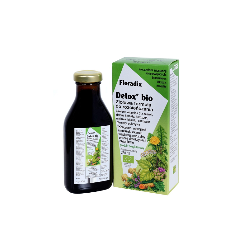 Floradix Detox bio to ekologiczny suplement diety na bazie ziołowych wyciągów z witaminą C. Karczoch i ostropest mają pozytywny wpływ na wątrobę, poprzez co wspierają oczyszczenie organizmu. Pokrzywa wspomaga układ moczowy. Mniszek lekarski wykazuje dobroczynny wpływ na trawienie.
