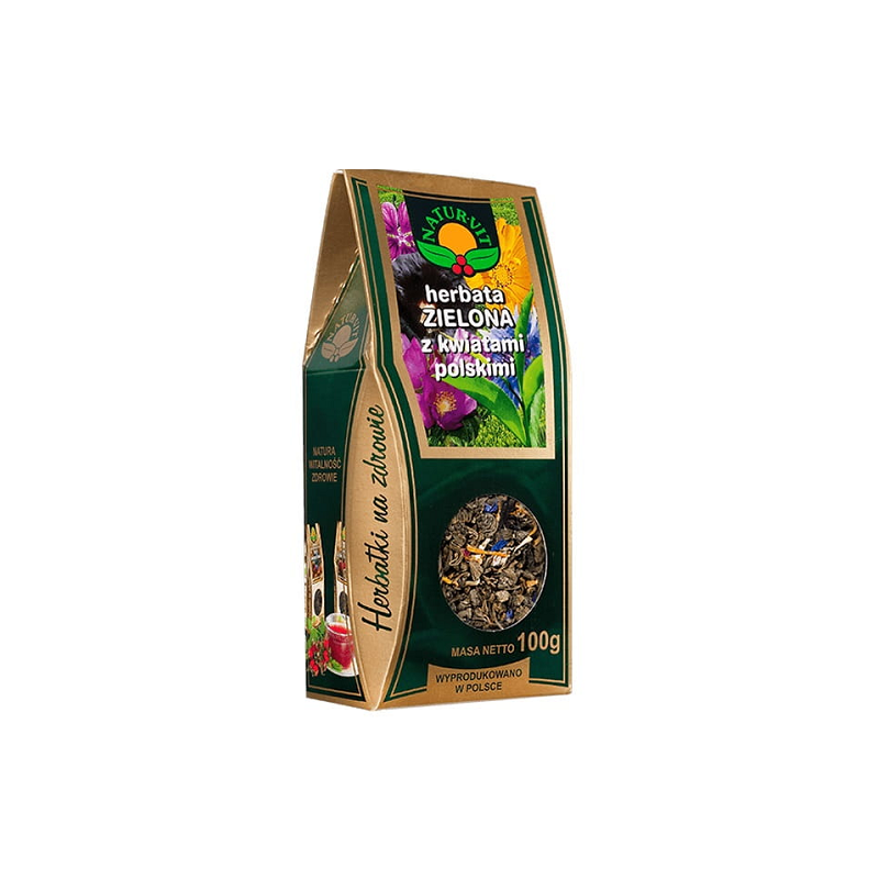 Herbata zielona, płatki róży, kwiat ślazu polskiego, kwiat malwy czarnej, płatki nagietka, kwiat chabra bławatka, aromat