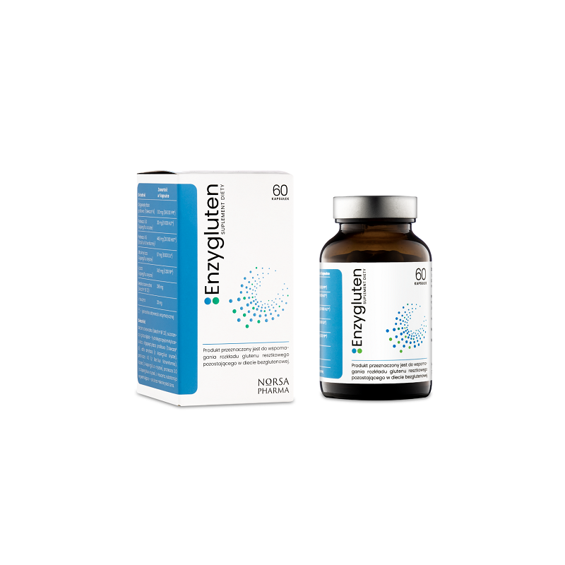 Enzygluten to kompleks enzymów trawiennych, wspomagający rozkład glutenu resztkowego w diecie bezglutenowej.