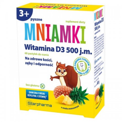 Mniamki Witamina D3 500 j.m. o smaku ananasowym to suplement diety przeznaczony do stosowania w celu uzupełnienia niedoborów witaminy D w diecie dzieci powyżej 3. roku życia.