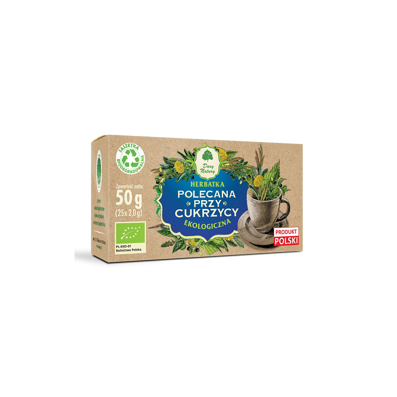 borówka czernica liść* 23%, brzoza liść*, cykoria korzeń*, tawuła ziele*, rutwica ziele*, naowocnia fasoli*, mniszek kwiat*, mniszek korzeń*, szałwia liść*, melisa liść*, kocanka kwiat* w różnych proporcjach