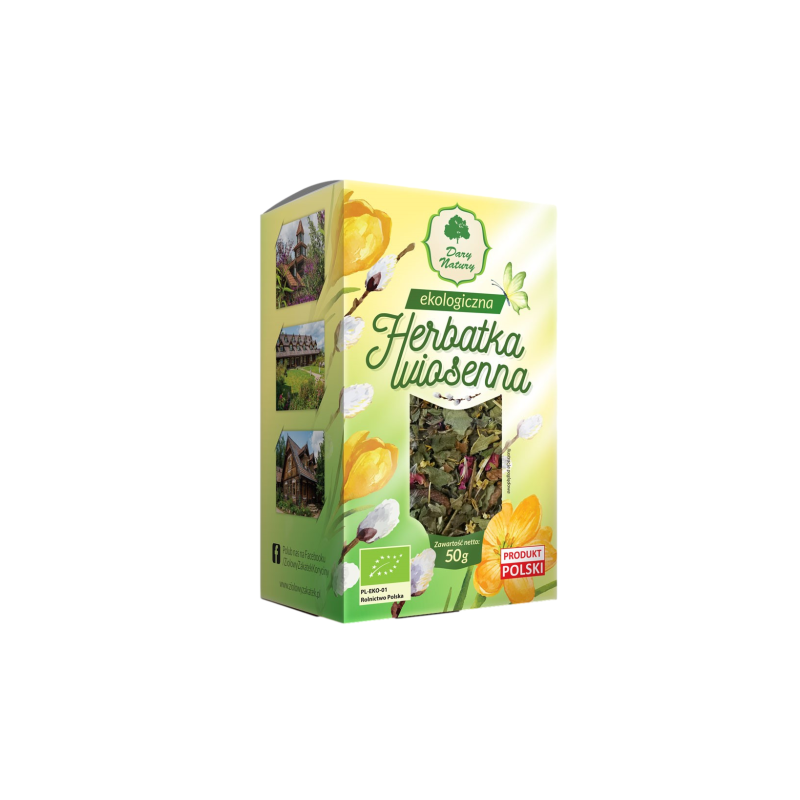 mięta liść*, poziomka liść*, brzoza pączki*, bez czarny kwiat*, mniszek kwiat*, fiołek kwiatostan*, stokrotka kwiatostan*, tarnina kwiat*, róża płatki*. *produkt rolnictwa ekologicznego