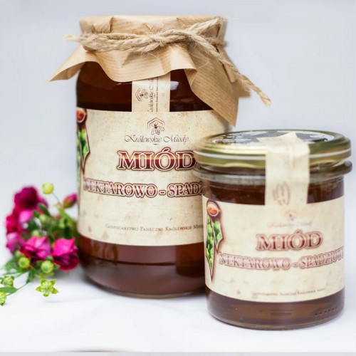 Miód nektarowo-spadziowy to połączenie przewagi spadzi jodłowej z miodami nektarowymi. Nektar pszczoły zebrały w lesie z kwiatów dzikich jeżyn, niecierpka oraz innych roślin runa leśnego, kwitnących w lipcu i sierpniu. Miód nektarowy ze spadzią charakteryzuje się wyrazistą nutą żywiczną i jest tańszy od czystego miodu spadziowego.