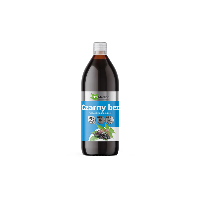 Czarny bez EkaMedica. Wsparcie odporności* - Czarny bez EkaMedica. Wsparcie odporności* - suplement diety w formie płynnej, wyprodukowany z soku 100% z owoców czarnego bzu z dodatkiem witaminy C naturalnego pochodzenia. Pasteryzowany