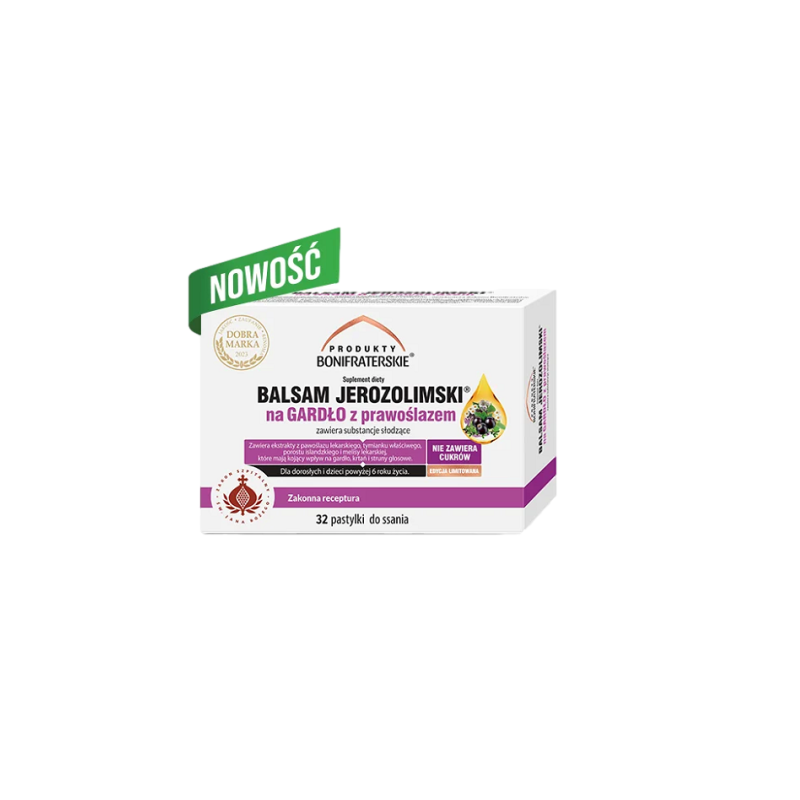 BALSAM JEROZOLIMSKI® na GARDŁO z prawoślazem to pastylki o przyjemnym, porzeczkowo-ziołowym smaku z zawartością naturalnego aromatu z czarnej porzeczki. Bez zawartości cukrów.