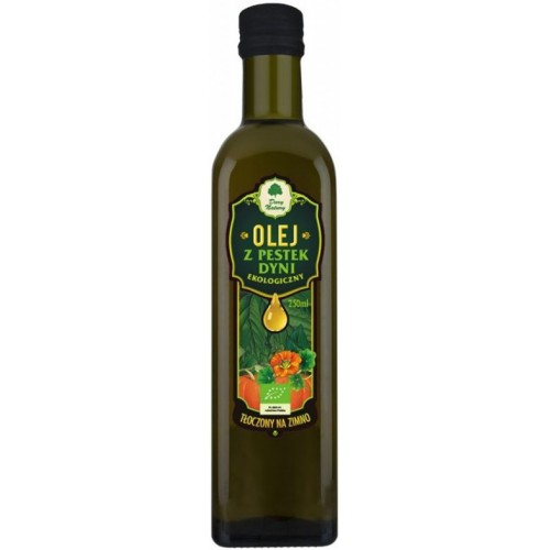 Nasz olej tłoczony jest na zimno z nasion dyni pochodzących z Polskich ekologicznych gospodarstw rolnych. Olej ten jest bardzo bogaty w witaminy E a także C, A, D i B. Według literatury zielarskiej ze względu na swoje właściwości jest szczególnie cenny w profilaktyce chorób prostaty oraz chorób układu ruchu jak również zwalnia procesy starzenia się organizmu. Ma przyjemny smak i zapach, dobrze komponuje się z ziemniakami, kaszami, sałatkami, surówkami, rybami.