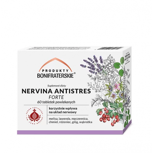 Nervina Antistres Forte suplement diety to preparat będący owocem wielowiekowej tradycji Zakonu Bonifratrów zawierający odpowiednio dobrane składniki ziołowe. Zgodnie z zakonną recepturą, powstałą w oparciu o 400 lat doświadczenia Braci Bonifratrów, preparat zawiera ekstrakty z: melisy i szyszek chmielu, które pomagają radzić sobie z napięciem i rozdrażnieniem.