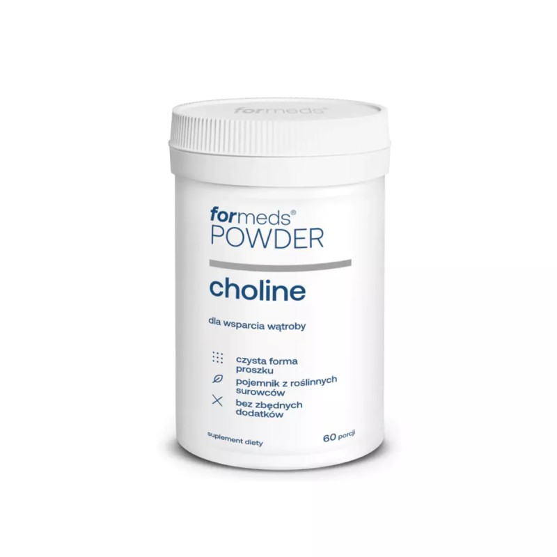 Suplement diety F-CHOLINE zawiera cholinę w formie proszku.