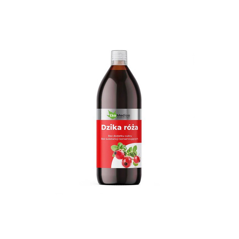 Dzika róża - suplement diety w formie płynnej, wyprodukowany z soku 100 % z owoców dzikiej róży z dodatkiem naturalnej witaminy C pochodzącej z ekstraktu z owoców camu camu. Pasteryzowany.2