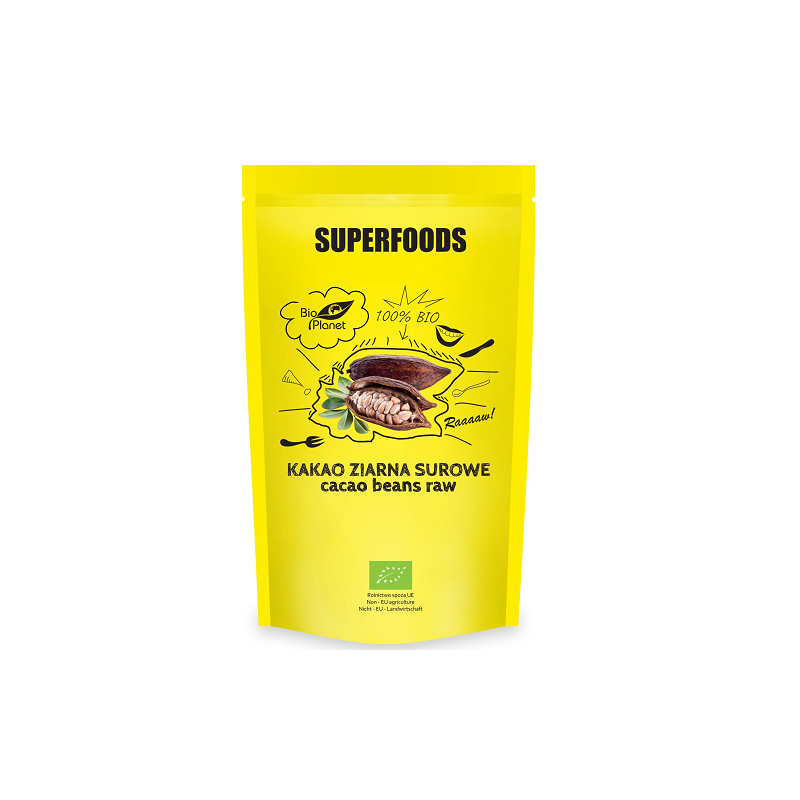 Ekologiczne surowe całe ziarna kakao, otrzymane z najwyższej jakości ziaren kakaowca. Charakteryzują się wytrawnym kakaowym smakiem. Przetwarzane w niskich temperaturach w celu zachowania maksymalnej ilości składników odżywczych. Stanowią podstawowy składnik czekolady. Mogą stanowić bazę dla wielu produktów czekoladowych lub dodatek do wszelkiego rodzaju przekąsek, lodów, koktajli, musli, ciast, deserów, jak również do kawy i gorącej czekolady.