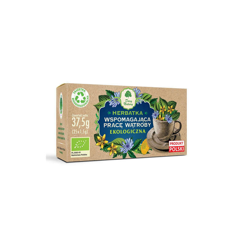 Herbatka wykonana jest z ziółek korzystnie wpływających na pracę wątroby.